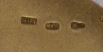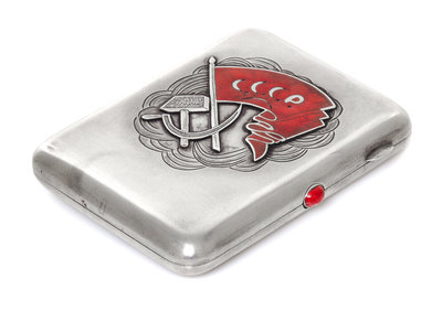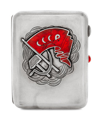 the lid decorated with the Soviet hammer and sickle beneath a red enamel banner reading CCCP and having a pink cabochon clasp.