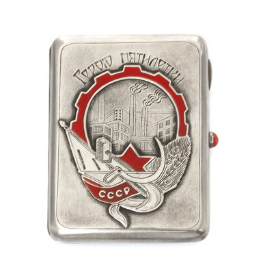 the lid decorated with applied symbols of the Soviet Union and engraved with the Cyrillic phrase Hero of the Five-Year Plan, with a pink cabochon clasp.