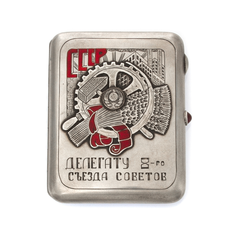 the lid centered by the seal of the Soviet Union surrounded by the hammer, sickle, cog and wheat above an engraving commemorating the Eighth Soviet Congress.