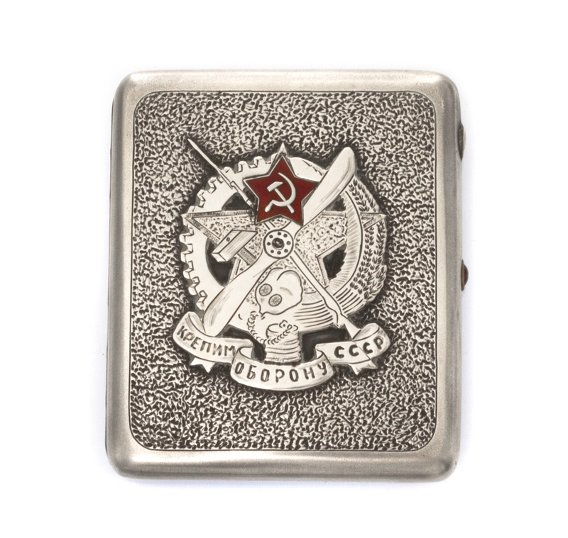 of rectangular form, the lid applied with the seal of OSOAVIAKHIM, the underside decorated with a silhouette of a bi-plane with an engraved Cyrillic inscription and a red cabochon clasp.