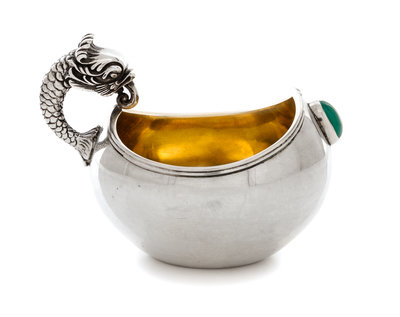 having an applied dolphin-form handle, the bowl with reeded decoration along the rim with a green cabochon affixed to the body.
