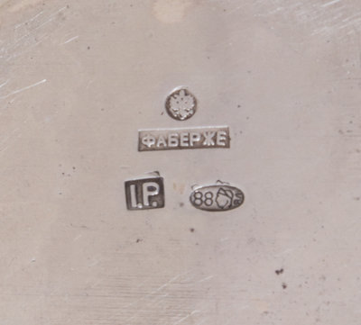 Mark of Faberge with Imperial warrant, master mark of J.A. Rappoport, assay mark of Yakov Lyapunov, St. Petersburg
