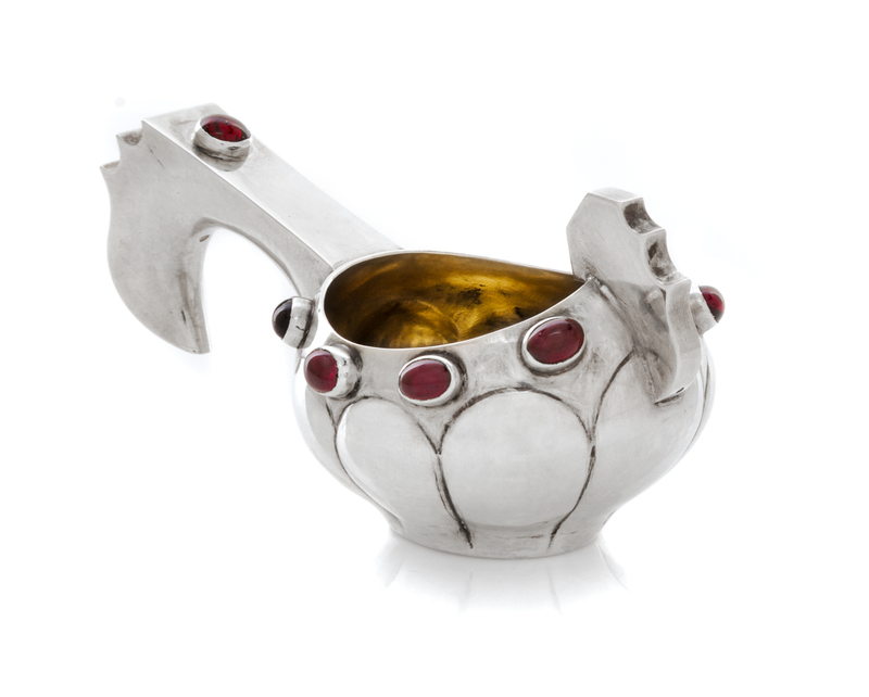 having a lobed body, the rim and handle decorated with garnet cabochons.