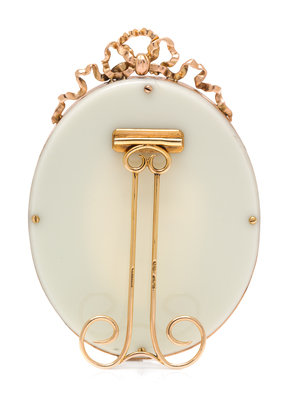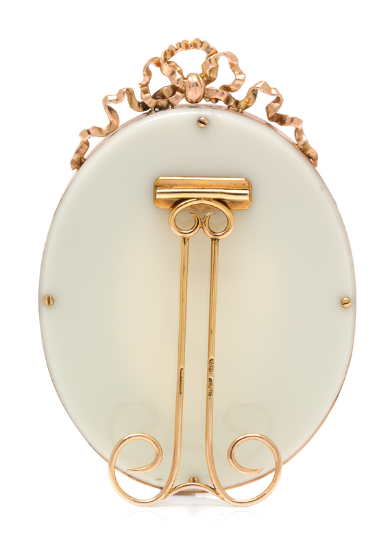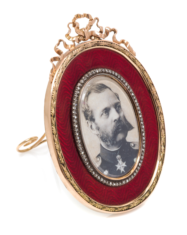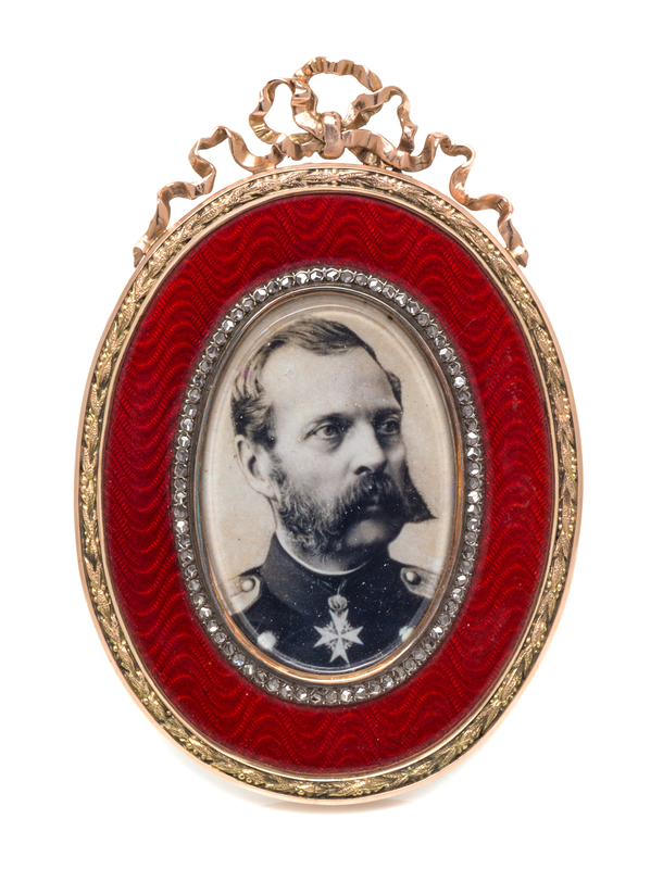 having a ribbon tied crest atop the oval body centered by a photograph of Czar Alexander II surrounded by rose cut diamonds, the outer rim decorated with foliate banding.