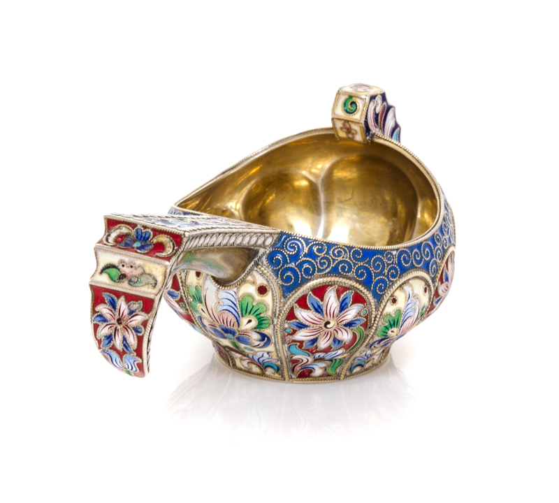 having a lobed body and decorated throughout with polychrome floral and foliate enameling with filigree scrolls.