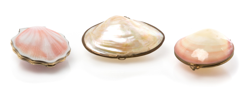 the hinged seashell case having a silver-gilt border and opening to a mirrored interior and a covered powder well, together with two seashell change purses.
