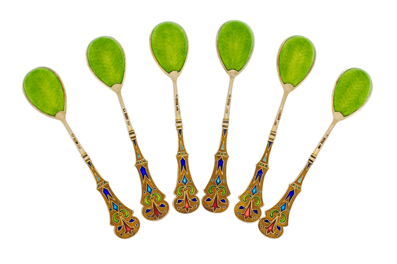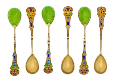 A Set of Six Russian Silver-Gilt Guilloche and Plique-a-Jour Enamel Demitasse Spoons