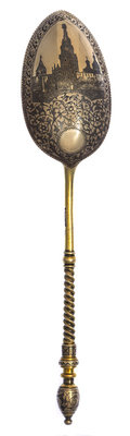 having a foliate scroll niello decorated finial surmounting a twist and knopped handle, the underside of the bowl with a niello scene of the Moscow Kremlin surrounded by floral and foliate scrolls.