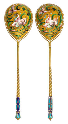 A Pair of Russian Silver-Gilt and Enamel Serving Spoons