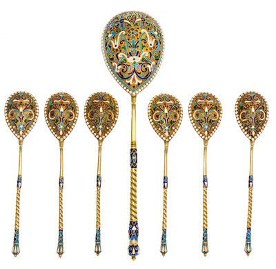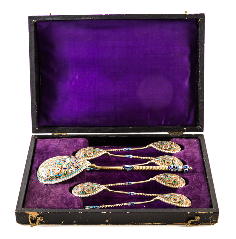 A Set of Russian Silver-Gilt and Enamel Spoons