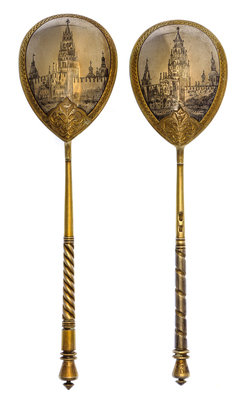 each having a twist handle, the underside of the bowl decorated with a niello scene of the Moscow Kremlin surrounded by a gilt braided border and foliate scroll cartouche.