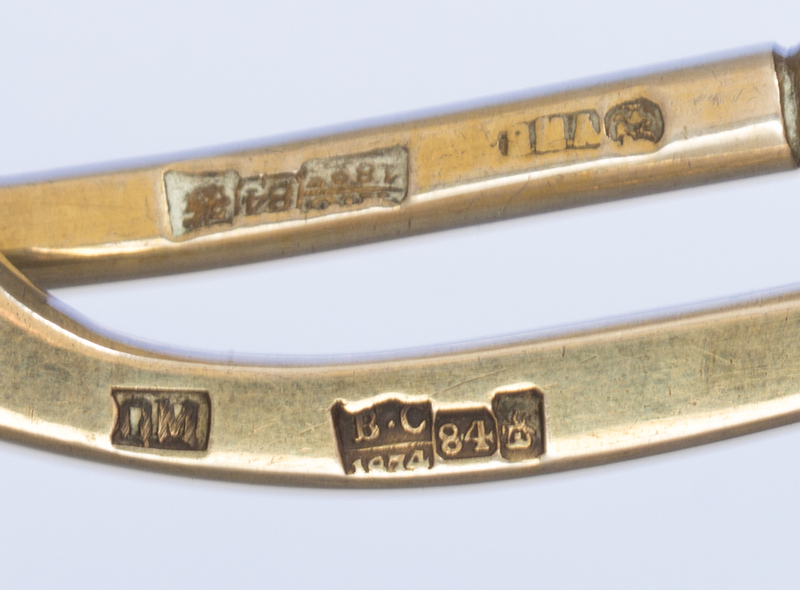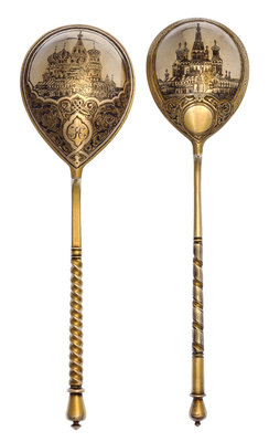 each having a twist handle, the underside of the bowls with niello scenes of St. Basel's Cathedral and foliate volutes.