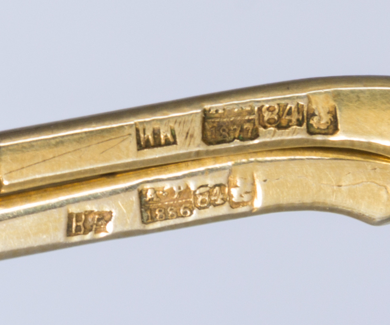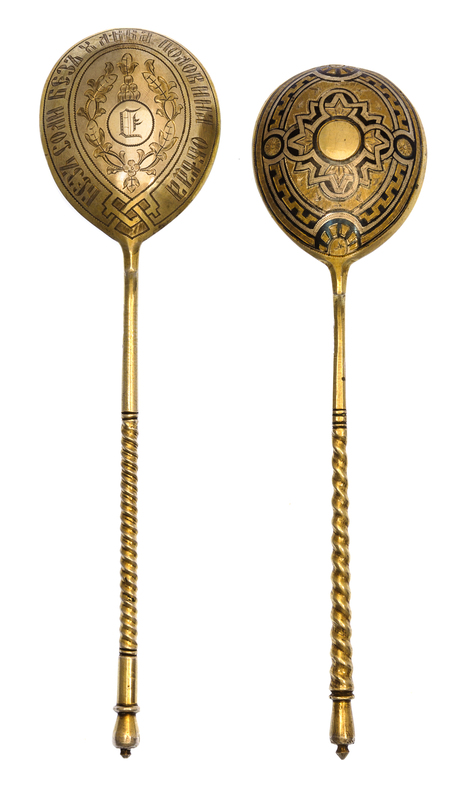 the underside of one bowl with niello geometric decoration, the other with engraved foliate swags surrounded by a Cyrillic inscription.