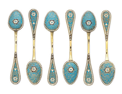A Set of Six Russian Silver and Enamel Demitasse Spoons