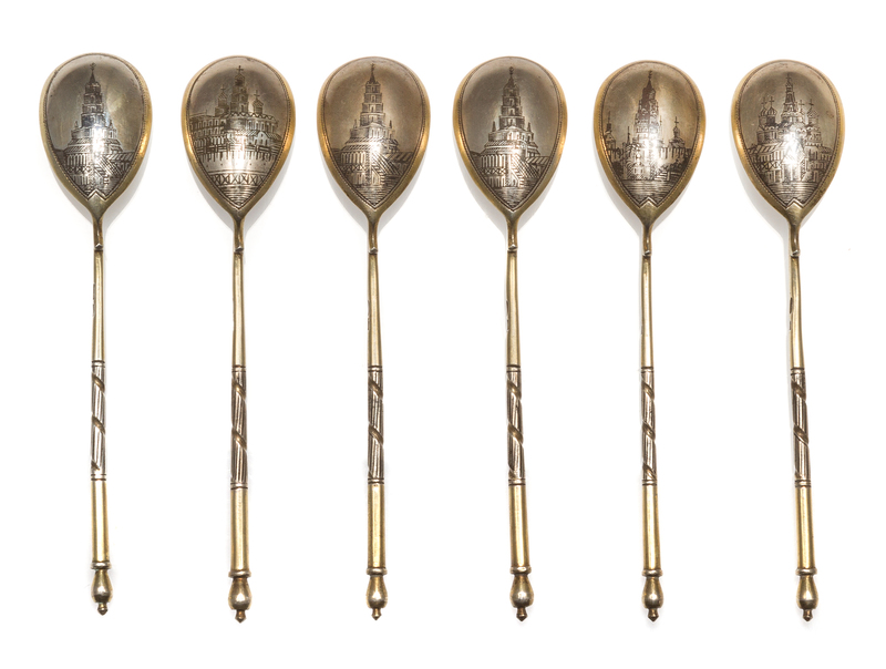 Six Russian Niello Silver Spoons