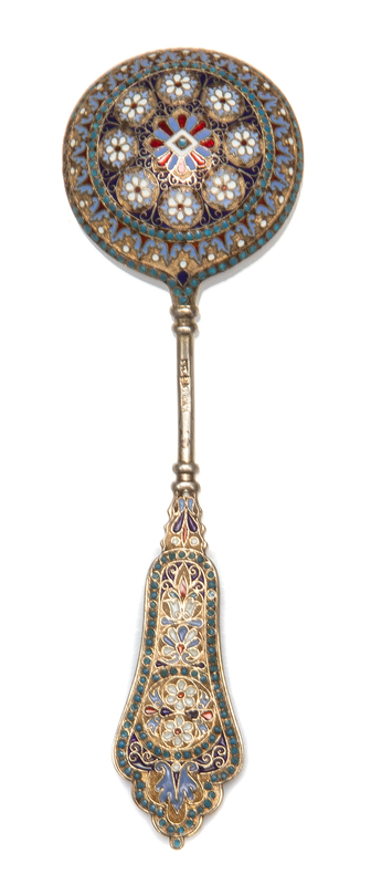 the top and undersides of the handle and bowl decorated with polychrome floral and foliate enamels and filigree scrolls.
