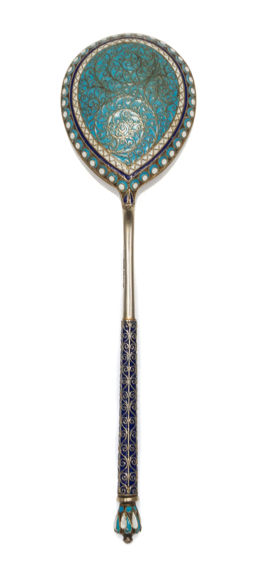having an enamel finial on a filigree scroll decorated handle, the underside with a light blue ground and filigree scrolls throughout.