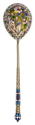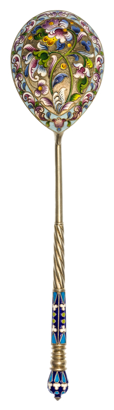 having a blue enamel finial on a twist handle, the underside of the bowl with polychrome enamels on a matte gilt ground.