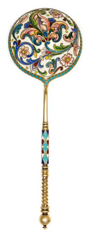 having a spherical finial on a twist handle, the underside with polychrome floral and foliate enamel on a white ground.