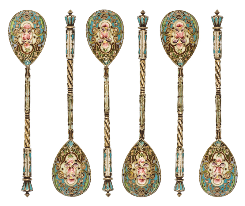A Set of Six Russian Silver-Gilt and Enamel Demitasse Spoons