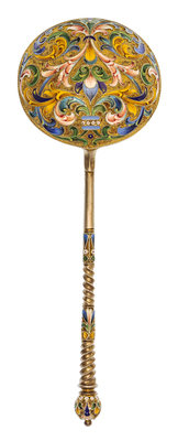 having a spherical enamel decorated finial surmounting a twist handle, the underside with a matte gilt ground with polychrome foliate scrolls.