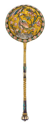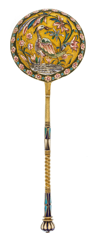 having an enameled finial on a twist stem, the underside of bowl with a polychrome scene of a crane wading in a marsh, surrounded by a floral band.