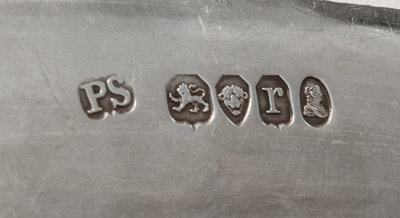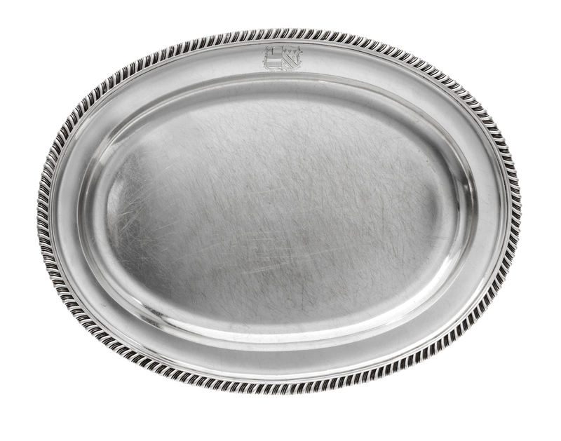 retailed by Storr & Mortimer, London, of oval form with an engraved coat of arms and a gadrooned border.