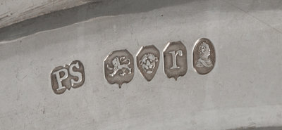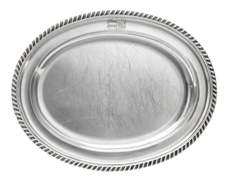 retailed by Storr & Mortimer, London, the platter of oval form with an engraved coat of arms and a gadrooned rim.