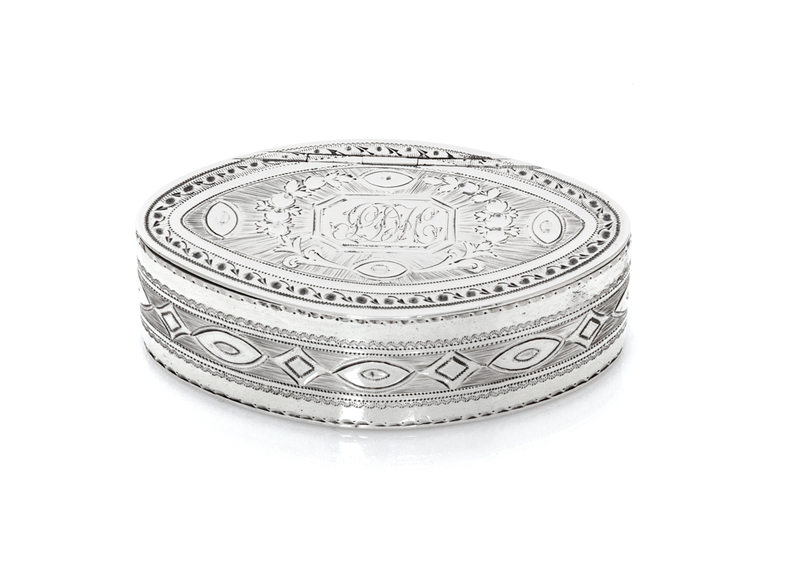of oval form, the hinged lid centered by a rectangular monogrammed cartouche surrounded by floral sprays.