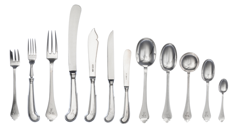 all engraved with block monogram F over N*L, knives with pistol handle, comprising18 dinner knives18 dinner forks18 lunch knives18 lunch forks18 fish knives18 fish forks18 fruit knives18 fruit forks18 butter spreaders18 oyster forks18 dessert spoons18 soup spoons18 bouillon spoons18 ice cream spoons18 demitasse spoons36 teaspoons2 table spoons2 cold meat forks2 serving spoons
