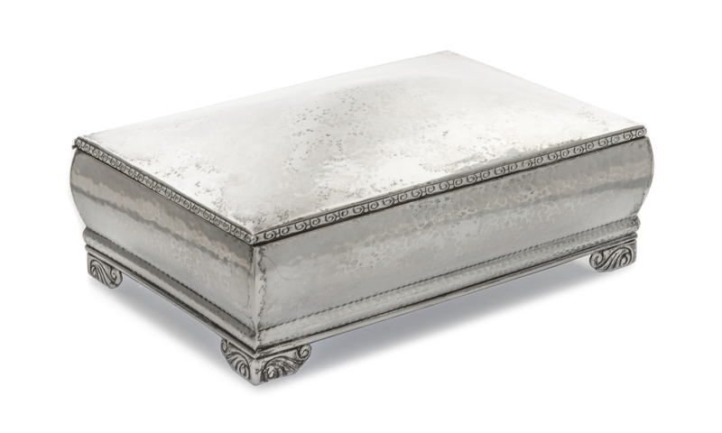 the rectangular box with bombe sides and domed lid, spot-hammered exterior and wood-lined interior, raised on scrolled bracket feet.