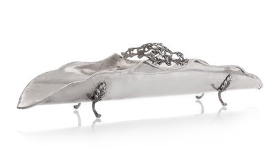 having a curved body with a pierced foliate scroll handle and raised on four paw feet.