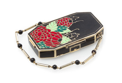 of rectangular form with canted corners, the exterior having a black enamel ground, the lid with polychrome foliate and berry motifs with an attached chain.