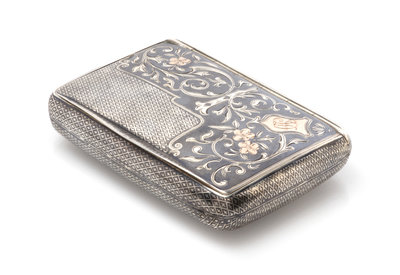 of rectangular form, the lid decorated with floral and foliate engraving with a monogrammed cartouche, the case worked with a geometric pattern throughout.