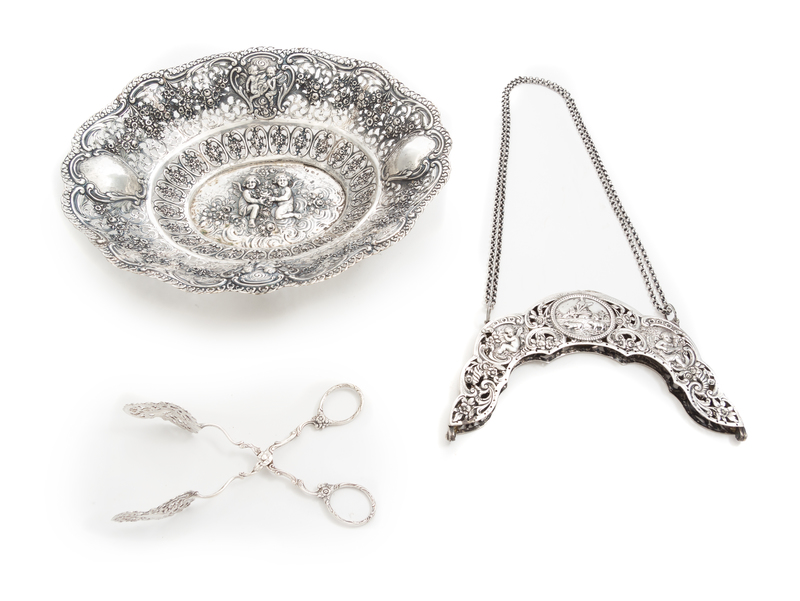 comprising a fruit bowl, a purse frame with attached chain and serving tongs, each having pierced floral and figural decoration.