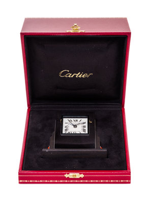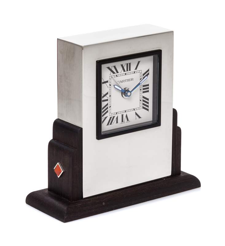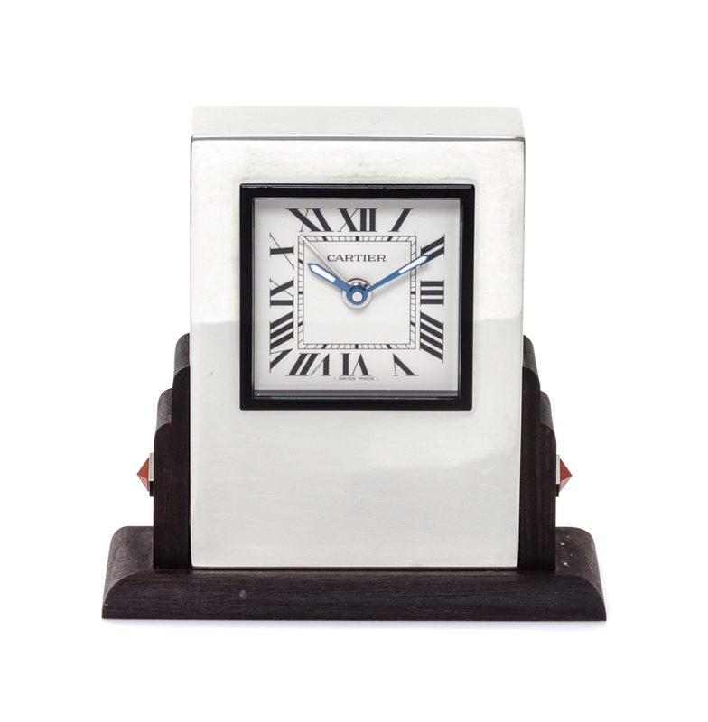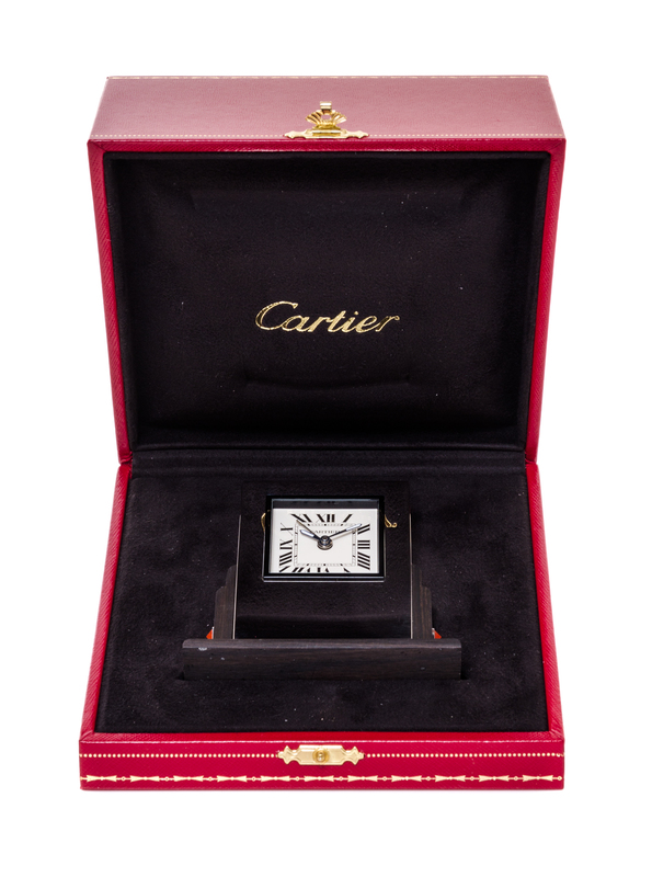 the case of rectangular form having a palladium finish, the square dial with Roman numeral hours and signed Cartier, raised on a shaped wood base with jasper accents, serial number 2748 1619 99GD.