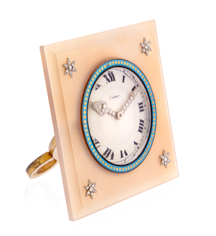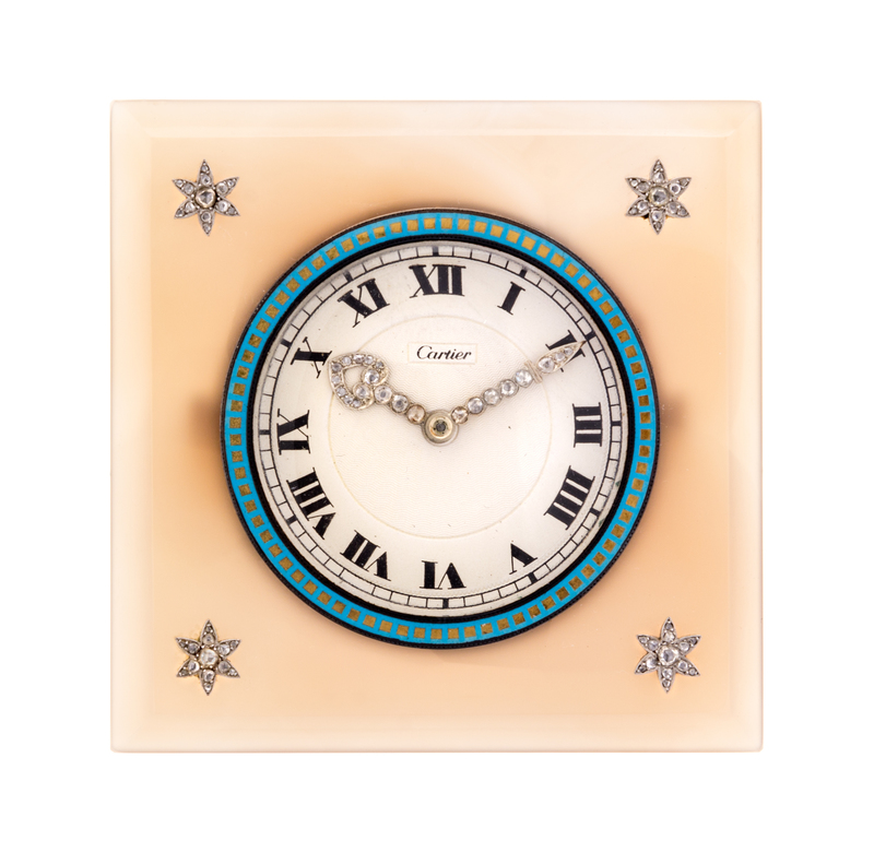 A Cartier Agate and Diamond Mounted Desk Clock