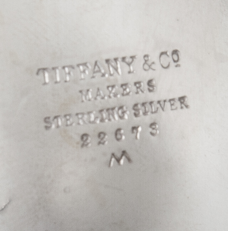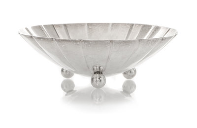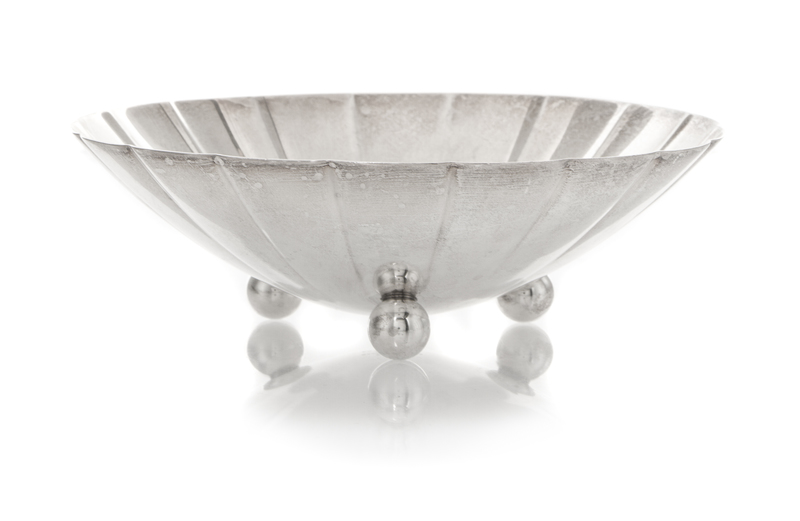 circular with scalloped sides, raised on three ball feet, engraved in center with monogram RHG.