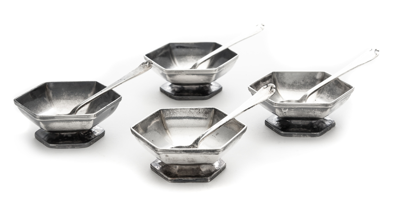 comprising four hexagonal salt cellars with four salt spoons.