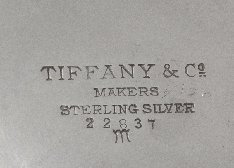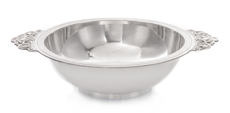 of circular form, the rim having applied flat handles cast with stylized flowers flanked by foliage.