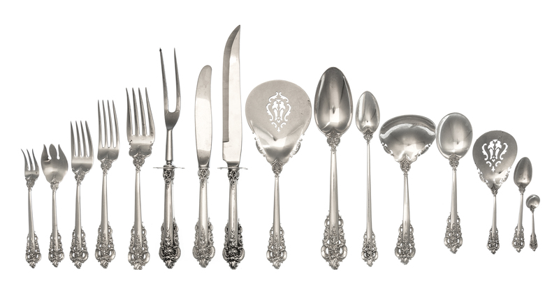 Grand Baroque pattern, comprising:10 dinner knives12 luncheon knives11 luncheon forks12 dinner forks8 salad forks12 soup spoons12 teaspoons12 cocktail forks12 salt spoons12 butter knives12 iced tea spoons6 dessert spoons5 demitasse spoons21 serving articles