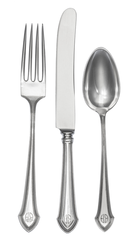 comprising: 12 dinner knives11 dinner forks11 luncheon forks10 table spoons23 teaspoons12 fruit spoons13 salad forks11 butter spreaders11 iced tea spoons12 soup spoons12 demitasse spoons16 serving articles