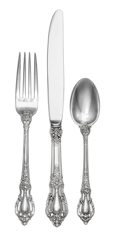 Eloquence pattern, comprising:12 dinner knives11 luncheon knives11 butter spreaders12 dinner forks12 luncheon forks12 salad forks24 teaspoons11 bouillon spoons10 iced tea spoons6 soup spoons3 table spoons2 carving knives2 carving forks2 cold meat forks1 knife sharpener1 cake server1 cheese slice1 cream ladle1 sauce ladle1 jelly spoon1 sugar scoop1 lemon fork