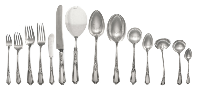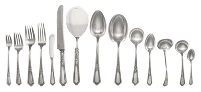 D'Orleans pattern, comprising:12 dinner knives12 dinner forks12 salad forks12 cocktail forks18 teaspoons12 soup spoons12 coffee spoons6 bouillon spoons12 butter spreaders1 table spoon1 serving spoon1 cream ladle1 lemon fork1 serving fork1 mashed potato server