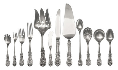 Francis I pattern, comprising:10 dinner knives12 dinner forks12 cocktail forks12 dessert forks12 iced tea spoons10 teaspoons8 butter spreaders6 soup spoons4 fish forks1 sugar scoop1 cake server1 pierced serving fork