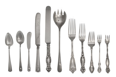 comprising: 27 dinner forks23 dinner knives23 luncheon forks 13 dessert forks 11 salad forks3 serving forks 19 cocktail forks 4 fruit knives18 serving spoons110 teaspoons 15 table spoons15 demitasse spoons12 bouillon spoons2 iced tea spoons6 soup spoons1 master butter knife2 serving knives 31 butter spreaders8 ice cream forks1 child's forktogether with 86 silver-plate assorted flatware articles