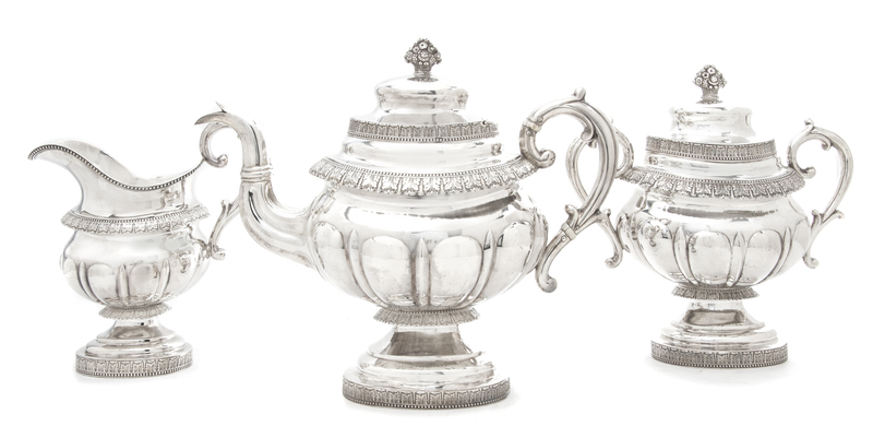 comprising a teapot, a covered sugar and a creamer, the lidded items with flower basket finials, each having lobed bodies with foliate and beaded banding, raised on stepped feet.