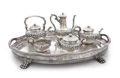 comprising a water kettle, a teapot, a coffee pot, a covered sugar and a creamer, together with an associated silver-plate tray, the silver items monogrammed FHC.