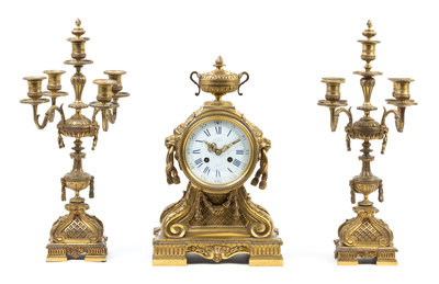 the clock having an urn finial atop an enamel dial with Roman numeral hours and Arabic minutes signed Jules Petit / Ft. de Bronzes / 16 Rue Tronchet / Paris and flanked by lion masks, the case with quatrefoils and foliate scroll decoration throughout, together with a pair of similarly decorated five-light candelabra.