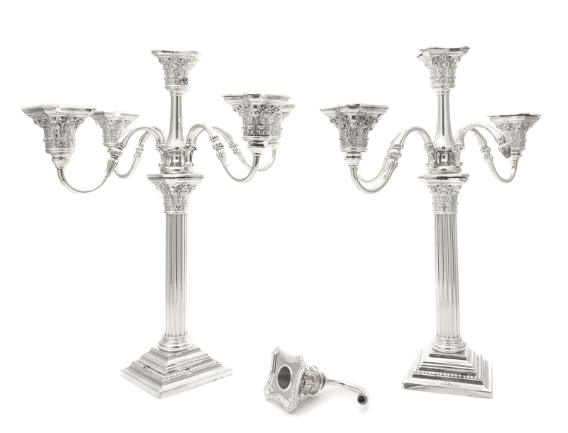 retailed by Spaulding & Co., having a fluted Corinthian columnar stem, the candle cups in the form of a Corinthian capital, weighted.